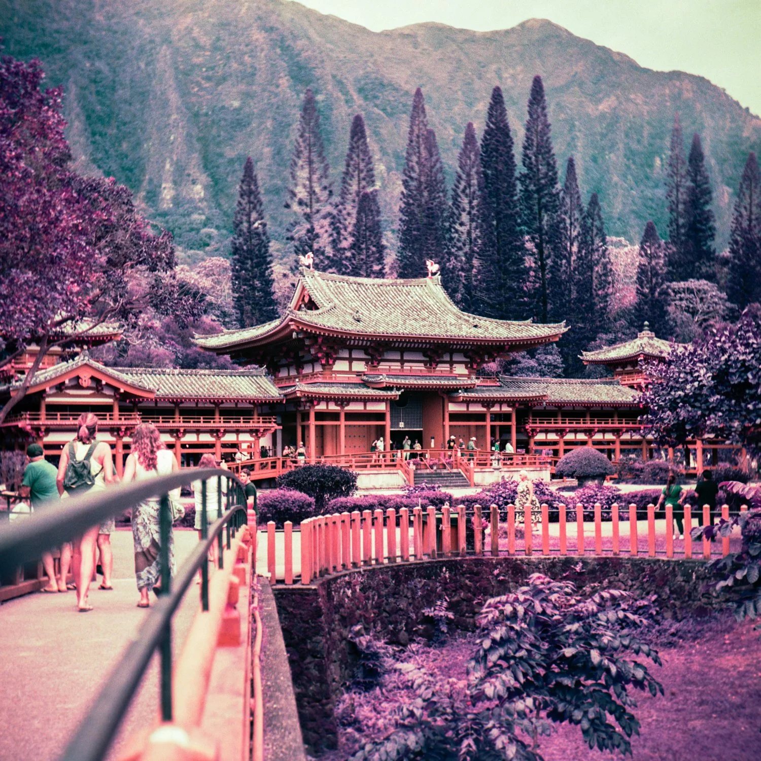 Lomopurple is a unique emulsion that shifts greens to purples, whites to pinks, yet red remains red. This is the main reason I wanted to visit Byodo-In Temple. I was curious to see how the red temple would look enveloped in a sea of purple trees and mountains.